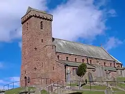 St Vigeans Church[3] served as parish church to the inhabitants of Arbroath up to the Reformation. Built of the local red sandstone, it was a large and impressive example of a Scottish medieval parish kirk. Its situation on top of a prominent, steep-sided mound (presumably of glacial origin, though doubtless 'improved' by landscaping) is striking. Dating in part from the 12th century, but largely 15th century in date, the church unfortunately underwent a drastic 'restoration' in the late 19th century which, while it uncovered many Pictish fragments, also replaced most of the original architectural features of the church. It retains its internal round-pillared arcades, but all the doors and windows were renewed, so their original appearance has been lost. The western tower was also heightened and 'improved' by adding a castellated top and cap-house. The 18th-century headstones in the kirkyard, some of which are notably well carved, are interesting examples of folk-art, characteristic of Angus. There was once a legend that the kirk was built with stones used by an enslaved Kelpie, and for several years the local congregation would not enter the kirk during certain services for fear the building would collapse due to the Kelpie's curse.