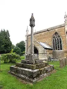 Within the churchyard to the south of the church is a 14th-century ashlar cross with tapering shaft. A gabled lantern was added in 1906 in 14th-century style, with Pevsner describing the cross as "with a square base with scooped-out top corners and part of the shaft." The cross, Grade II listed and a scheduled monument, might be a previous village market cross.[12][35][36][37]