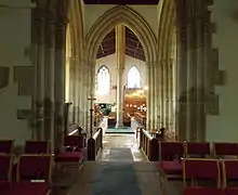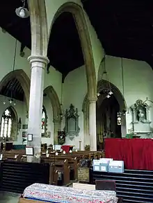 Between the nave and the chancel is a four-arch crossing which runs under the tower, with shallow transepts to the north and south. The arches are of 13th-century Decorative period and style. The piers are composed of five columns each with circular rolled capitals. The arches are moulded and pointed, with the nave arch bordered by a hood mould with label stops. There are mason marks on both nave-side pillars. To the south of the west crossing arch at the east of the nave, above and behind the Sir Charles Hussey monument, is a blocked entrance for a previous rood screen loft, indicated by an ogee head moulding. The south transept contains the church sacristy, with the north transept a chapel dedicated to the Blessed Virgin Mary. Windows in both transepts are clear glazed. Both transepts contain aumbries, with the north, a wall statue bracket. Blocked rood loft access openings also exist at both east and west sides of the south transept.[1][12][15] Both transepts have previously been used as chapels.[6]