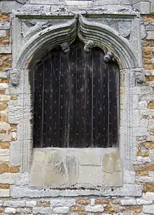 The nave, as with the chancel and north aisle, shows a banding construction from the ground to eaves in alternate courses of ironstone and ashlar. On its west are gabled buttresses, two at each corner, and one at the centre running to the point of the ridge—a further buttress supports the south wall, and all are topped by pinnacles inset with arched panels below crocketed spires. A bas relief Annunciation is worked into the top of the central west buttress, and this, and south facing buttresses, contain gabled statue niches with trefoiled inset surrounds. Two Decorated late 13th-century windows are placed in the west wall, one either side of the central buttress. They are of three lancets, with pointed heads, geometrical tracery—typically circular rosette devices dating from c.1250–1310—and hood moulds. Below the west wall south window is a late 14th-century door, now blocked, within an ogee-headed stone surround. The spandrels between the ogee and outer rectilinear enclosure contain on one side a dragon motif, and on the other, a shield. Beneath and attached to the ogee head are three grotesque bosses—a probable fourth is missing—as stops to the foiled moulding. The nave south wall is surmounted by a plain parapet holding projecting gargoyles. It contains two windows, each of four lights—one Decorated, the other with Perpendicular tracery—and both with hood moulds. Two small 15th-century windows sit beneath the easterly window, one of two lights, the other single.[1][12][13]