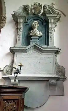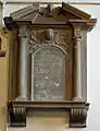 A chancel memorial—in the shape of a tombstone, with putto head, scrolling, and foliate devices below a pediment—is that to Edmund Weaver of Frieston (1683–1748), the astronomer, local land surveyor, and author of The British Telescope ephemerides.[32][33]