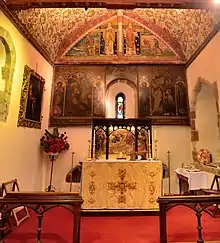 A church existed in Ovingdean at the time of the Domesday Book,[1] which recorded it as an ecclesiola ("little church").[3] This was rebuilt in the early 12th century, and most sources agree that no trace of the Saxon-era building remains.[1][3] The 12th-century chancel and nave form the basis of the present structure. A tower was added at the west end in the 13th century,[2] as was an aisle on the south side (reached by twin archways cut through from the nave).[1] This aisle no longer exists, and its fate is uncertain; however, ancient scorch marks and discoloured brickwork in the south wall of the nave suggest fire damage by the same French raiders who destroyed neighbouring Rottingdean's St Margaret's in 1377. (A stone tablet in the church also makes this claim.)[1][3]