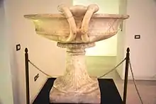 The villa was built at least in part on a 6th c. BC platform that may have levelled the ground on the hill.[38] Construction started at the latest in Augustus' reign and was significantly enlarged with the garden and swimming pool under Claudius.[39] The owner's name is not exactly known but it could belong to a certain Narcissus, a freedman, on the basis of stamps found on tiles, or to the Virtii family who had tombs not far away.