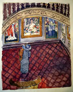 In the second decade of the century, and thus shortly after Roger Fry's Manet and the Post-Impressionists at the Grafton Galleries in 1910–11, the Stafford Gallery began to show more avant-garde, particularly French, works.[6] In 1911 there were exhibitions of paintings by Courbet (March),[7] Sickert (June),[8] Gauguin and Cézanne (November),[9] and possibly Camille Pissarro in October;[10] work by Vincent van Gogh may also have been shown.[6] The Gauguin show is the subject of Spencer Gore's painting Gauguins and Connoisseurs at the Stafford Gallery. In 1912 there were exhibitions of paintings by the Scottish Colourist J.D. Fergusson (March)[11] and drawings by Picasso (April).[12]