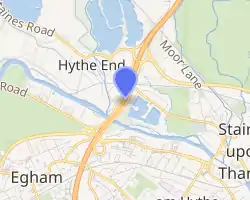 Staines Greyhound track opened on 21 January 1928, and the first race was won by a greyhound called Oojah over 55 yards.[2] The stadium was at Hythe End just north of the River Thames, south of Wraysbury Road. Previously this area was an unpopulated rural area that today makes up some of the Colne Valley Parks.[3] The track was very basic with one main stand on the home straight.[4] During its early existence it was sometimes referred to as Bell Weir Park.[5]