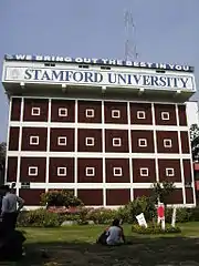 Stamford University Bangladesh[3] (Bengali: স্টামফোর্ড ইউনিভার্সিটি বাংলাদেশ) is a private university in Dhaka, Bangladesh. It was established in 2002 under the Private University Act.[4] Before starting as a university, its predecessor institution was known as a Stamford College Group established in 1994,[5] later it was upgraded as private university of Bangladesh in 2002 and appeared as Stamford University Bangladesh. Stamford University is the first ISO certified university in Bangladesh.[6] Stamford University Bangladesh is fully approved by UGC.[7]