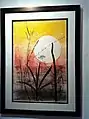 Jones said of his own work: I found much freedom in the lines of Dylan Thomas to interpret them in many different ways. I have always been interested in the cosmic-creation of the universe, the sun, the moon, stars, space and nature-things that never change and are always there. These are often referred to in Dylan Thomas' poetry My other particular interest is with Celtic symbolism; I believe this may be due to my upbringing on a farm in Pembrokeshire where I was surrounded by relics of ancient history. Consequently, some of my works are based on Celtic Crosses and Cromlechs Although most of the paintings are in watercolour, I find working in mixed media quite interesting and stimulating . In some cases, there is an element of the [printmaking] technique appearing. This mixing of media may be due to the teaching of Art and Design in a Comprehensive school.