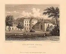 Standish Hall was an estate and country house, built in 1573, owned by the Standish family in the south-west of Standish, Wigan. No standing structures of the hall remain on the former estate, however, some of its wooden-panel interiors are preserved elsewhere.