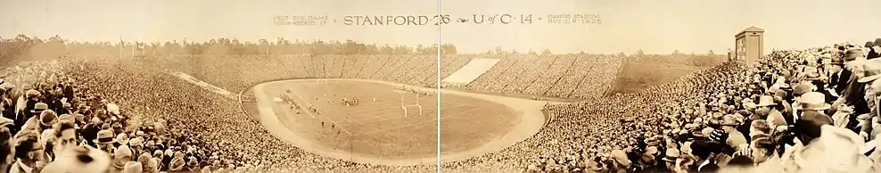 Stanford Stadium was built in five months in 1921 and opened its gates on November 19, replacing Stanford Field.[12] The first game was against rival California, who defeated Stanford 42–7 in the Big Game.[13] Seating capacity was originally 60,000, with a 66-row, U-Shaped structure second only to the Yale Bowl in size at the time.[14]