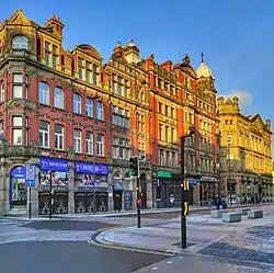 Victoria Street did not exist as a parallel street to Dale Street until around 1867 to 1868. When New Street was originally built, it was not linear as is seen on the present day Stanley Street. The land at the lower end did not originally belong to the Earl and, therefore, did not continue all the way to Frog Lane (later Whitechapel) in a straight line. It took on a zigzag course as a result. When Stanley Street was leased by the Earl, the upper end became known as 'Upper Stanley Street', while the lower end was known as 'Lower Stanley Street', or 'Derby Street', for a significant period after.[3][4] After Victoria Street was built in 1867 to 1868, this was altered and Stanley Street then formed a straight line leading from Dale Street to Whitechapel, as it is seen today.[5][6]