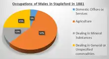 In the 1880s majority of the men's occupation was within agriculture, whereas women were more into the domestic service. The professional occupation had the fewest people working within that sector for both genders.[6] According to the Office of National Statistics,[7] 67% of Stapleford's population are Christian.The following 26% classify themselves as nonreligious, 5% did not state their religious preference and the rest are the other religions. The village has many churches to accommodate to the Christians.The Office of National Statistics[8] show that the people of Stapleford generally have very good health with 299 out of 567 classified as having very good health and the next big group having good health. As a whole the health rate is high, despite the 18 individuals who either have bad health or very bad health. The health rate in this area suggests that the village has very good health care sector. Lastly, information published by the 2011 Census stated that the largest ethnic group is White British, as[9] 537 out of 567 people are of this ethnicity showing that the village is not multicultural.
