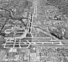 In the late 1930s the facilities consisted of two hangars and a small administration building mainly used for air mail processing.[3][5] United Airlines and Continental Airlines began service in 1937.[3] The March 1939 Official Aviation Guide (OAG) shows nine weekday departures: seven United and two Continental.