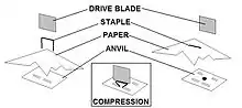 When stapling with a stapler the papers to be fastened are placed between the main body and the anvil. The papers are pinched between the body and the anvil, then a drive blade pushes on the crown of the staple on the end of the staple strip. The staple breaks from the end of the strip and the legs of the staple are forced through the paper. As the legs hit the grooves in the anvil they are bent to hold the pages together. Many staplers have an anvil in the form of a "pinning" or "stapling" switch. This allows a choice between bending in or out. The outward bent staples are easier to remove and are for temporary fastening or "pinning".