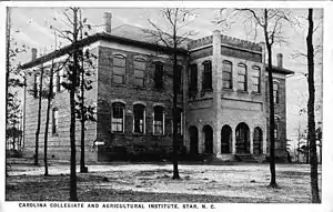 Sometime around 1900, a bottling plant was established in Star by J.R. Ingrahm to bottle sodas for the area. This company preceded the Coca-Cola Plant in Star, which was later moved to Biscoe, North Carolina. Also in 1900, the Montgomery Roller Mill was incorporated with a capital stock of $4700 by Braxton Auman, who also operated a whiskey distillery and chair factory. In 1907, Star's first undertaker, Mr. H.D. Phillips, established a funeral parlor. This was the beginning of a long and successful business for the Phillips family who still operate the Phillips Funeral Home today. Interesting to note was the organization of a "Carolina Collegiate and Agricultural Institute" around 1910 in Star by Dr. Edward F. Green that cooperated with the North Carolina A & M College in Raleigh. The town saw massive growth between the years of 1912 and 1950 when the Norfolk Southern Railway (former) purchased the old lines of the Aberdeen and Asheboro Railroad and the Durham and Charlotte Railroad. The operation held a depot, water tank, and coal chute in Star. This new era saw the introduction of the hosiery mill industry, a boom in lumber production, various new stores and products, and a huge surge in population. In 1914-1915, Boy Scout Troop 111 was established in Star, one of the earliest in North Carolina. Since that point, the town continued to slowly grow into a prosperous community. In the 1960s the town undertook the task of erecting some of the first public housing units in the state. On March 14, 1969, Lancer Inc., one of the nation's Top 50 upholstered furniture manufacturers, started its operations in Star and continues to be one of Star's largest employers, having expanded its operations six times. Since then, the hosiery mills experienced a decline and eventually left Star. This left hundreds unemployed and the once prosperous town of Star began to wither away. The buildings that once employed many now mostly sit empty. In September 2013, downtown Star was honored by being listed on the National Register of Historic Places as the Star Historic District.[9]