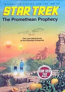 Star Trek: The Promethean Prophecy is a text adventure game developed by Trans Fiction Systems and published by Simon & Schuster Software in 1986 during the 20th anniversary of the Star Trek: The Original Series. The game was developed by Ron Martinez and Jim Gasperini who also worked on Hidden Agenda.[1] The player assumes the role of James T. Kirk captain of the USS Enterprise which has sustained heavy damage after being attacked by an unknown entity. A landing party headed by Kirk beams down to a nearby planet to find food for the ship's crew as the resources onboard became contaminated during the attack.[2][3]