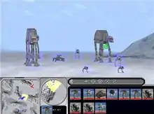 Originally conceived as a 2D strategy game, LucasArts canceled the overall design after its first public viewing at E3 1998.[6] LucasArts instead used an optimized version of a 3D engine supplied by Ronin Entertainment,[7] delaying the game from its original late 1998 or early 1999 release timeframe to an early 2000 release. The company said it took the time to ensure innovation in this competitive genre on no exact deadline.[8] The game was jointly developed by LucasArts and Ronin Entertainment, using Ronin's programmers and engine partnered with LucasArts's project leadership, designers, and artists. The final patch for the game is version 1.1 released in March 2000. The soundtrack consists of hard rock and techno remixes of John Williams's original Star Wars scores, done by Peter McConnell.[9] More than 3,500 voice lines were recorded for the game.[10]