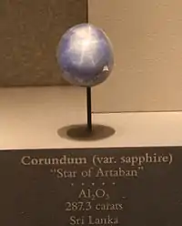 The Star of Artaban is a 287โcarat cabochon-cut star sapphire currently located at the Smithsonian National Museum of Natural History. Its origin is somewhat obscure but it is believed to come from Sri Lanka. Unlike some other sapphires, it is not transparent and is of a milky blue colour. It was donated by an anonymous member of the Georgia Mineral Society in the 1941โ1943 time period.[1]