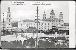 The bridge is named after the nearby Nikolsky Cathedral. Initially, the bridge was called Nikolsky. However, in 1849, after the nearby bridge across the Catherine Canal began to be called Novo-Nikolsky, the bridge over the Kryukov Canal was named Old Nikolsky or Staro-Nikolsky.[3][4]