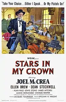 Stars In My Crown is a 1950 Western film directed by Jacques Tourneur and starring Joel McCrea as a preacher whose faith tames an unruly town by inspiring the townspeople to change. It was based on the 1947 novel of the same name by Joe David Brown.[2]