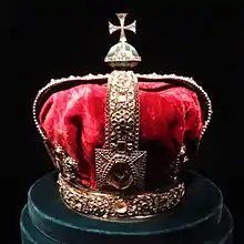 The State Crown of George I is the imperial and state crown crafted in 1714 for King George I. It was modified and used by subsequent monarchs until 1838. The empty gold frame and its aquamarine monde which dates from the reign of King James II are both part of the Crown Jewels of the United Kingdom.[1] They are on public display in the Martin Tower at the Tower of London.