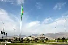 A traditional flower laying ceremony is held at the Monument to the Constitution and the Main Flag of Turkmenistan. The head of state and the participants in festive ceremonies lay flowers to the national flag. Festive events and performances in Ashgabat take place at the Saparmurat Turkmenbashi Olympic Stadium. Prison amnesty from the President is also traditionally held on Flag Day.[5] Festive events marking the holiday also take place in all regions of the country.[6] Turkmen pop artists and singers performs folk songs at central squares.[7] In 2020, on the night of 18 May, the colors of the flag of Turkmenistan were flashed on the Tbilisi TV Broadcasting Tower, cumulating the holidays events in Georgia which also included an event organized by the Tbilisi City Hall with the support of the Embassy of Turkmenistan in Georgia.[8][9]