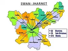 JharNet (JharNet) is one of the largest e-governance network in South East Asia with 90% horizontal offices connected through optical fiber and wireless. United Telecoms Limited has implemented the State Wide Area Network project where the Government offices in the districts, Sub Divisional Headquarters and the Blocks are networked with the State Headquarters at Ranchi for providing Voice, Video and Data Services.[9] JharNet made extensive use of Wireless Network as well as Optical fiber to connect to remote office apart from the traditional Leased Lines.