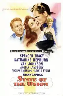 State of the Union is a 1948 drama film directed by Frank Capra about a man’s desire to run for the nomination as the Republican candidate for President, and the machinations of those around him. The New York Times described it as “a slick piece of screen satire...sharper in its knife-edged slicing at the hides of pachyderm schemers and connivers than was the original.”[5] The film was written by Myles Connolly and Anthony Veiller and based on the 1945 Russel Crouse, Howard Lindsay Pulitzer Prize-winning play of the same name.