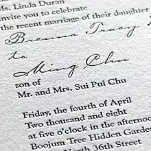 Engraving is a process that requires a design to be cut into a plate made of relatively hard material. The metal plate is first polished so that the design cut can be easily visible to the person. This technology has a long history and requires a significant amount of skill, experience, and expertise. The finished plate is usually covered in ink, and then the ink is removed from all of the un-etched portions of the plate. The plate is then pressed into paper under substantial pressure. The result is a design that is slightly raised on the surface of the paper and covered in ink. Due to the cost of the process and expertise required, many consumers opt for thermographic printing, a process that results in a similarly raised print surface, but through different means at less cost.