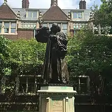 George Whitefield was an evangelist active in the Methodist movement of the mid-1700s.[1] During a trip to the Thirteen Colonies between 1739 and 1741, he preached in Philadelphia in a small building that had been built for that purpose.[1] Following Whitefield's sermons, the building would be used by Benjamin Franklin as the location for a new institution of higher learning, which would eventually become the University of Pennsylvania.[1] Around 1914, the bicentenary of Whitefield's birth, there was a push to erect a statue in his honor. The previous year, during a meeting in New York City, Methodist members of the university's alumni association discussed the possibility of erecting a statue of Whitefield,[1] and the following year the provost of the University of Pennsylvania gave a speech in his honor that contributed to the movement.[2] In 1914, R. Tait McKenzie, a sculptor and the university's director of physical education, was commissioned for the project,[3] and he began working on a design for the statue by 1917.[1] The statue would be one of several that McKenzie would make for the university, including a statue of Edgar Fahs Smith and one of Franklin.[4][5] In researching Whitefield, McKenzie sought out as many portraits as he could find of the man, traveling to Boston and London in the process.[1] By 1918, the casting for the statue was completed, and a dedication was set for the university's Alumni Day,[1] June 15, 1919.[note 1] At the unveiling, Wallace MacMullen, D.D. gave a speech that chronicled Whitefield's life and his contributions to evangelism,[6] while a choir played the hymn "For Famous Men", which included verses that honored Whitefield.[2] The monument as a whole was a gift to the university from the Methodist Alumni Committee.[3]