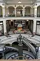 The property was again remodeled in the 1970s and then called the John Plankinton Mall. The latest redesign of the property between 1980 and 1982 incorporated a circular atrium specifically for the statue. The property was again renamed and called Shops of Grand Avenue or sometimes shortened to The Grand shopping plaza. Grand Avenue was the name of a 19th-century prestigious street and is now called Wisconsin Avenue. In 2012 restoration work was done to the bronze statue that took several months. Afterwards it was returned to its base made by the American Bronze Company. This base at the foot of the bronze statue is titled John Plankinton 1820 – 1891. The statue on its 15 foot (4.6 m) pedestal is now a permanent part of the shopping plaza and is viewed by hundreds daily.[3][7]