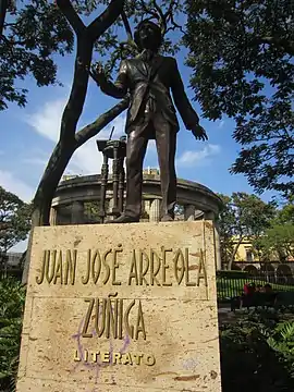 The statue of Juan José Arreola is installed along the Rotonda de los Jaliscienses Ilustres, in Centro, Guadalajara, in the Mexican state of Jalisco. The statue was installed on 20 September 2015 and it was inaugurated the next day, the 97th anniversary of his birth. His rests remain there.[1][2] It is a bronze statue that weights 220 kilograms (490 lb) and features Arreola with his hand slightly raised.[3] It was created by Rubén Orozco, aided by Claudia and Orso Arreola, Juan José's offsprings.[3]