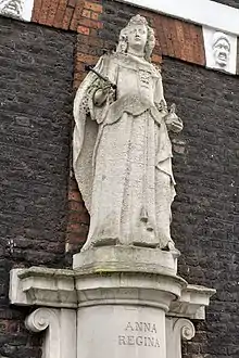 A Grade I-listed statue of Queen Anne stands on a pedestal alongside the north wall of No. 15 Queen Anne's Gate in Westminster, London.[1][2] It portrays the queen wearing a brocaded skirt and bodice and an open cloak[3] with the insignia of the Order of the Garter; on her head is a small crown and in her hands she holds an orb and sceptre.[4] The statue, carved from Portland stone, stands on a plinth of the same material with the inscription ANNA REGINA.[1] The pedestal consists of a fat "engaged" cylinder with a flat volute on either side, each with scrolls adorned with carved flowers and leaves. Neither the sculptor's identity nor the exact date of the work are known, but it is probably of the early eighteenth century.[5]