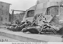 In June 1919, the obelisk was joined by a statue of liberty. It was created by the sculptor, Nikolay Andreyevich Andreyev. Vera Alekseyeva, the niece of Konstantin Stanislavski, might have posed for this statue.[2] Another possible model was the actress at МХАТ, Eugenie Khovanskaya, who was famous for her beauty.[3] The sculptor was inspired by the dynamic forms of classical Greek statues such as Nike of Samothrace.