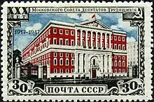 In 1918, the Skobelev monument was replaced by the Monument to the Soviet Constitution.[1] The 26 metres (85 ft) high, three-edged obelisk built in honour of the Soviet constitution, was erected in front of the Mossovet.