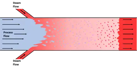 The Steam Infusion process was first developed in 2000 by Pursuit Dynamics PLC as a method for marine propulsion.[5] The process has since been developed to be used for applications in brewing, food and beverages, public health and safety, bioenergy, industrial licensing, and waste treatment worldwide. On the right a diagram shows how the process creates an environment of vaporised product surrounded by high energy steam. The supersonic steam flow entrains and vaporises the process flow to form a multiphase flow, which heats the suspended particles by surface conduction and condensation. The condensation of the steam causes the process flow to return to a liquid state. This causes rapid and uniform heating over the unit making it applicable to industrial cooking processes. This process has been used in industry, predominantly in soup and sauces applications. Its possible benefits include reduced cooking times, easier cleaning with no burn-on, ingredient reduction and energy savings.