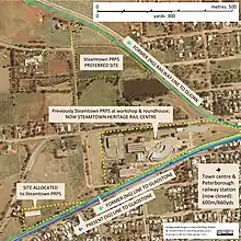 In the early days of the society, Australian National, which managed the railway facilities and operations at Peterborough, allowed rolling stock to be stored within its 19-stall roundhouse. The society saw the need to establish its own facilities, and proposed to establish its own depot on a block of land 200 m (220 yards) north of the boundary of the railways site holding the workshops and roundhouse.[note 1] Members saw it as an ideal site, since it had mains water, power and sewerage. The society also proposed that a triangle could be installed, and Australian National agreed to provide the land at a nominal rent.[19] Despite the proposal, it was not approved and a greenfield site 600 metres (660 yards) west of the roundhouse was allocated by the council.[note 2] Construction of a depot started in 1980.[20] The substantial task of laying track to connect the depot to existing track was completed in 1983.[21]