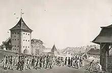 ![]() The death of Lieutenant Rudolf von Werdt on 18 September 1802, an episode of the Stecklikrieg. Pen and ink drawing by Karl Ludwig Zehender (1751–1814). | |||||||