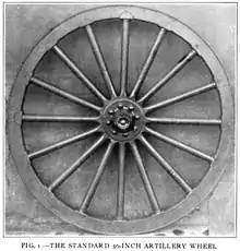 This wheel design that came be called artillery wheels was extensively used with artillery.[4] For example, this type of wheel was used on the pictured Armstrong gun, used in Japan in 1868. A similar design was used for a gun carriage for the US Army's 3.2 inch gun in 1881, with a wheel diameter of 57 inches (1,448 mm), based on testing of an Archibald Wheel Company design. By 1917, the 14-spoke wheel evolved to have 16 spokes, 0.5 inches (12.7 mm) high-carbon-steel tires, 2.875 inches (73.0 mm) felloes (8 sawed or 2 bent), improved spoke shoes, and 0.25 inches per foot (21 millimeters per meter) dishing, to arrive at the "standard" wheel pictured.[3]