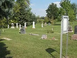 The history of Steelesville Cemetery dates back to the 1860s when the first Swedish immigrants to the area arrived and settled in the farming community south of Dassel, Minnesota. Most all of these settlers arrived with personal belongings of little value, but rich in Christianity along with their deep-seated trust in God. On February 13, 1873, a meeting was called and held at the house of Sven Harling for the purpose of discussing the advisability of organizing a new Lutheran congregation. Out of that meeting came a congregation named “The Swedish Evangelical Lutheran Congregation of Steelsville, Meeker County, Minnesota”. At the first annual meeting, held January 2, 1874, it was reported that a piece of land had been procured and a church building erected without debt, in Section 11, a place better known as the Dahlman Skog. At this location ten children and three adults members were buried. Two and a half years later the road past the church was closed. As a result, on September 20, 1876, Sven Harling, although never a member of the church, agreed to donate one acre of land in the southwest corner of his Section 3 farm and a decision was made to move the log church building. In early 1877 the church building was relocated to the site. The fee ownership of the land was then transferred on February 4, 1878.[1] The church building was placed in the southeast corner of the one-acre lot as the road at that time, better known as the Dassel-Hutchinson Stage road, was then located on the east side of the present day Steelesville Cemetery. Shortly thereafter, in the same year, a petition was presented by ten men of the congregation, to relocate the congregation and build a new church building in Dassel, Minnesota. On September 26, 1877, a congregational decision was made: 1) that the högmässo gudstjänster, or the högmässo worship be held in Dassel, Minnesota after the beginning of 1878; 2) that services on Sunday afternoons and week days be held in Steelesville; 3) that even after the congregation is moved to Dassel, this property (Steelesville Cemetery) shall always be kept – the grounds for a cemetery and the building for school purposes. Thirty years later in 1908 the Steelesville church building was sold to John Bredeson. The building was moved to his farm and used as a barn. In 1919 extensive cemetery improvements were completed. All monuments were removed, then plowed, leveled and reseeded. The monuments were replaced, and the whole acre surveyed into lots with walks between each row. On March 31, 1970, the Steelesville Cemetery Association was incorporated as a nonprofit organization. On June 12, 1928, the congregation of The Swedish Evangelical Lutheran Congregation of Steelsville, Meeker County, Minnesota, changed its name to "First Evangelical Lutheran Church of Dassel, Minnesota". On February 16, 1981, the congregation again changed its name to "Gethsemane Evangelical Lutheran Church of Dassel, Minnesota". The cemetery continues to be owned by the same congregation since its inception.[2][3][4][5][6][7][8][9]