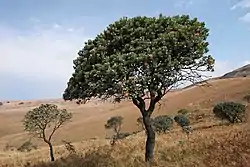 The mountain plateau retains extensive tracts of unspoilt habitat, supporting a large diversity of mammals, birds and plant life. The common tree fern Cyathea dregei occurs along watercourses and streams, while overgrazed mountain slopes and eroded ravines are often dominated by Leucosidea sericea shrubs.[3]