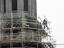 Once this has been done it is possible to use this access to begin building scaffolding to carry out any repairs which may be required. This is done by fixing anchors into the wall (whether concrete, stone, or brick) and "kicking" the scaffolding off from there.