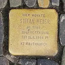 From March 1933 to March 1934, Stefan Meier was held captive in "protective custody" at the concentration camp Ankenbuck. After his release, Meier was proprietor of a tobacco shop in Freiburg. In 1939, he served as a driver for the motorized police. In October 1941, Stefan Meier, after denunciation by a neighbor, was arrested again and sentenced by a Special Court of Freiburg Regional Court for undermining military strength or "conspiracy to commit high treason" to three years in prison. Immediately after the completion of his prison term, Stefan Meier was transferred to the Mauthausen concentration camp, where he died in September 1944. The noted cause of death was "acute heart failure". Before his arrest, Stefan Meier did not have a history of heart problems.[3]