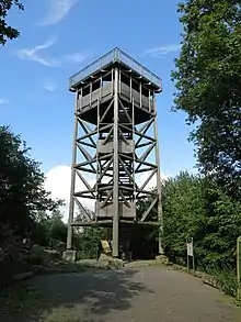 As early as 1888, the Taunus Club in Wetterau built a small wooden observation tower on the Winterstein.[6] In 2004 this was demolished due to its dilapidation. Through a citizens' initiative, people in Ober-Mörlen, Bad Nauheim and Friedberg succeeded, with the help of donations from companies, institutions, etc., in erecting a new, higher, five-story wooden tower (17.65 m)[7] with two viewing platforms built entirely from Douglas Fir wood and called Winterstein. The topping-out ceremony took place on 1 May 2005 and the tower was inaugurated on 3 July 2005.[8]