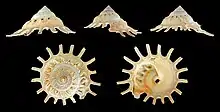 Shells medium-sized to large (diameter of base without attachments 65–128 mm; height of shell 48–70 mm), rather depressed to moderately high-spired, widely umbilicate, with wide peripheral flange (30-40% of total diameter at base) which is simple in some species or is digitate or divided into numerous long, hollow, narrow, parallel-sided spines. Ventral side of peripheral flange non-porcellanous. Foreign objects usually small to very small covering less than 30% of dorsal surface.[3]