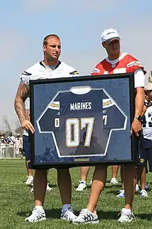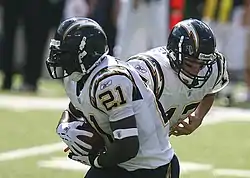 In August 2004, Rivers signed a six-year, $40.5 million contract with the San Diego Chargers that included $14.5 million in signing bonuses.[35] However, due to a protracted contract negotiation with the San Diego Chargers, Rivers only reported to the team during the last week of training camp, and incumbent Drew Brees retained his starting job. Rivers began the season as the Chargers' third quarterback option, behind Doug Flutie,[36] and ahead of the fourth quarterback on the depth chart, Cleo Lemon. Unfortunately for Rivers, Brees went on to have a then-career year and was named to the NFL Pro Bowl while winning the NFL Comeback Player of the Year Award.[37] Rivers received very limited playing time, playing in only two games. He only threw passes in the second half of the last game of the 2004 season, a victory over the Kansas City Chiefs, by which time the Chargers had already clinched a home playoff spot and the AFC West division title. In the victory, he threw his first touchdown pass to fellow rookie Malcom Floyd.[38] He was not on the active roster for San Diego's Wild Card Round playoff loss to the New York Jets.[39]