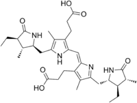 Stercobilin is a tetrapyrrolic bile pigment and is one end-product of heme catabolism.[1][2] It is the chemical responsible for the brown color of human feces and was originally isolated from feces in 1932. Stercobilin (and related urobilin) can be used as a marker for biochemical identification of fecal pollution levels in rivers.[3]