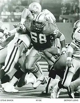 Steven William Baack (born November 16, 1960) is a former professional American football player who played defensive lineman for five seasons for the Detroit Lions. He was the 75th pick of the third round in the 1984 draft and one of several NFL players who were able to play multiple positions as roster athletes in the NFL in those years.[1] [2]
