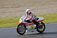 Born in Bellingham, Washington, Baker began his career racing on the dirt track ovals of the Pacific Northwest.[1] He then switched to road racing and began competing in Canada, becoming a three-time Canadian champion.[1] In 1976, Baker won the prestigious Imola 200 pre-season race.[2] His good results earned him a factory sponsored ride with the Yamaha factory team for the 1977 season.[1] He began the year by winning the prestigious Daytona 200 before traveling to Europe to compete in the world championships.[1][3][4] Baker won the 1977 Formula 750 title and finished second to Barry Sheene in the 500cc world championship.[5][6]
