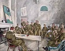 During the First World War, he worked with the Admiralty developing dazzle camouflage for ships. During World War Two, in March 1944, the War Artists' Advisory Committee offered Spurrier a commission of 50 guineas to paint a picture of an Army discussion group.[4] Spurrier exhibited at the Royal Academy from 1913, was made an associate member in 1945 and became a full member of the Academy in 1952.[2]