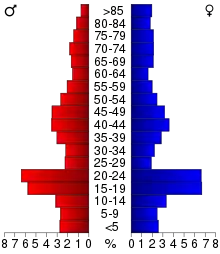 The county population contained 21.60% under the age of 18, 20.80% from 18 to 24, 21.60% from 25 to 44, 19.00% from 45 to 64, and 17.00% who were 65 years of age or older. The median age was 34 years. For every 100 females there were 93.90 males. For every 100 females age 18 and over, there were 91.00 males.